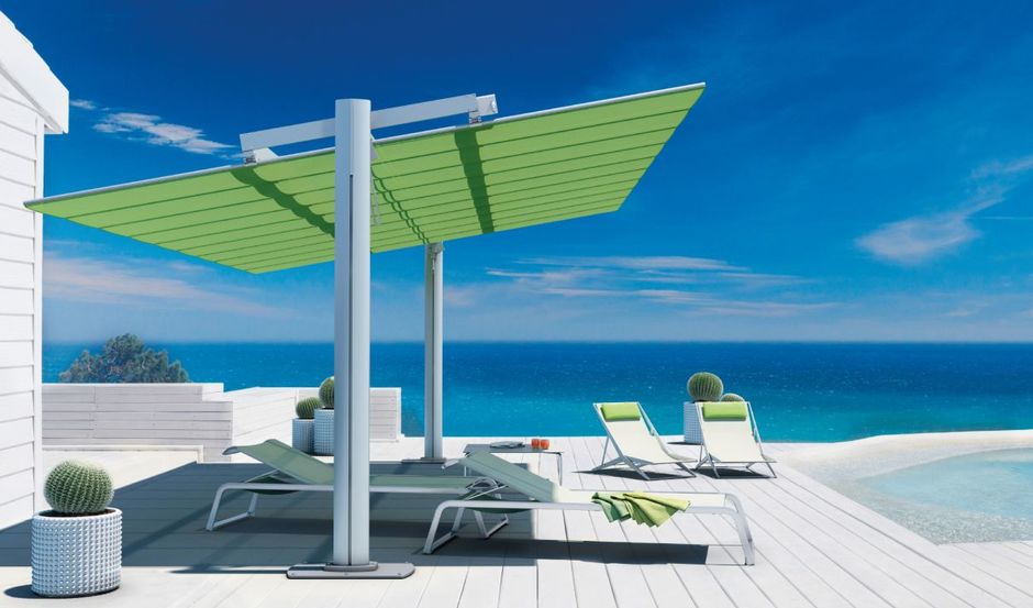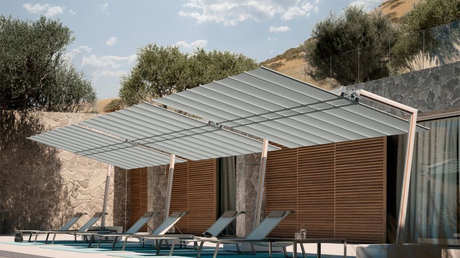 Wykończenie anodowane aluminium w kolorze jasno szarym (ANODIC).UWAGA: parasol złożony z 3. lub 4. elementów: dach (moduł) + słupki boczne + podstawy/obciążenia + ew. pale środkowe.